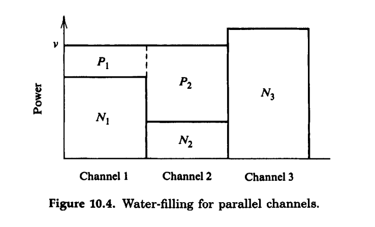 假设有多个高斯信道,每个信道噪声NiN_{i},要求功率和限制为PP。设给每个信道分配功率PiP_{i},于是问题成为优化问题:最大化12log(1+PiNi)\sum \frac{1}{2}\log (1+\frac{P_{i}}{N_{i}}),同时拥有限制iPi=P\sum_{i}P_{i}=P