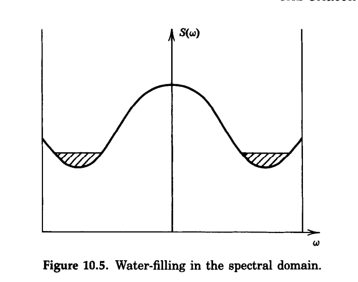 Consider a channel in which the additive Gaussian noise forms stochastic process with finite dimensional covariance matrix KZ(n)K_{Z}^{(n)}. If the process is stationary,then the covariance matrix is Toeplitz(每条左上-右下的线上所有元素相等) and the eigenvalues tend to limit as nn\to \infty. The density of eigenvalues on the real line tends to the power spectrum of the stochastic process. In this case, the above 'water-filling' argument translates to watter-filling in the spectral domain.